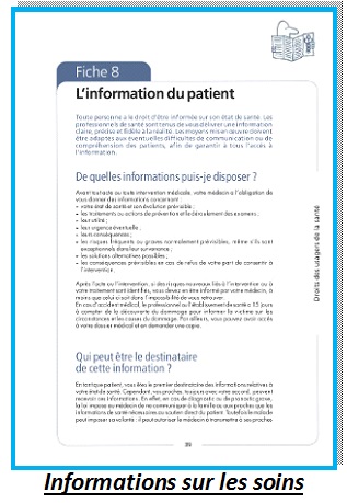 Vous avez le droit d’être informé sur votre état de santé. Les informations que le médecin vous fournira vous permettront de prendre librement avec lui les décisions concernant votre santé. Votre volonté d’être tenu dans l’ignorance d’un diagnostic ou d’un pronostic sera respectée, sauf lorsque des tiers sont exposés à un risque de transmission.