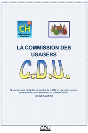 La Commission des usagers a pour missions de veiller au respect des droits des usagers et de contribuer à l’amélioration de la qualité de l’accueil des personnes malades et de leurs proches, et de la prise en charge. Au sein du CH de Limoux-Quillan, le choix a été fait d’une CDU intervenant aussi bien dans le champ sanitaire que médico-social pour les usagers de ces deux secteurs. La commission facilite les démarches de ces personnes et veille à ce qu’elles puissent, le cas échéant, exprimer leurs griefs auprès des responsables de l’établissement, entendre les explications de ceux-ci et être informées des suites de leurs demandes (démarches).